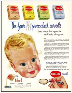 Further exploration revealed that the common US spelling for the word arose from the name of a pre-cooked and fortified baby cereal developed in the late 1920s by three Canadian paediatricians. PABLUM was designed to combat nutritional deficiencies, particularly rickets, in children, and contained a great array of very good things. These included wheat meal, oatmeal, cornmeal, bone meal, dried brewers’ yeast, powdered alfalfa leaf, and iron. It was one of the first commercial uses of additives to support human nutrition in manufactured foods. Babies needed this food because their diets were so appallingly limited in eras of food shortage notably during the Depression.